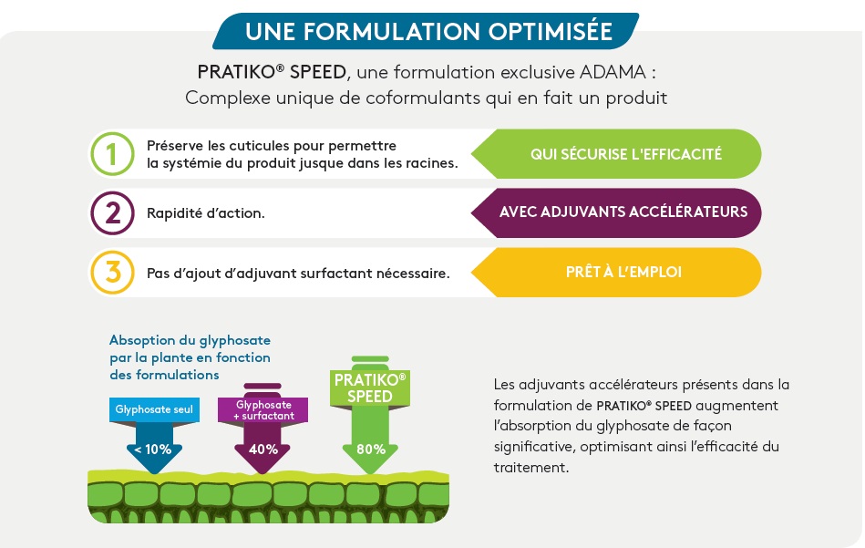 Pratiko® Speed est un herbicide systémique foliaire non sélectif des zones cultivées à base de glyphosate.