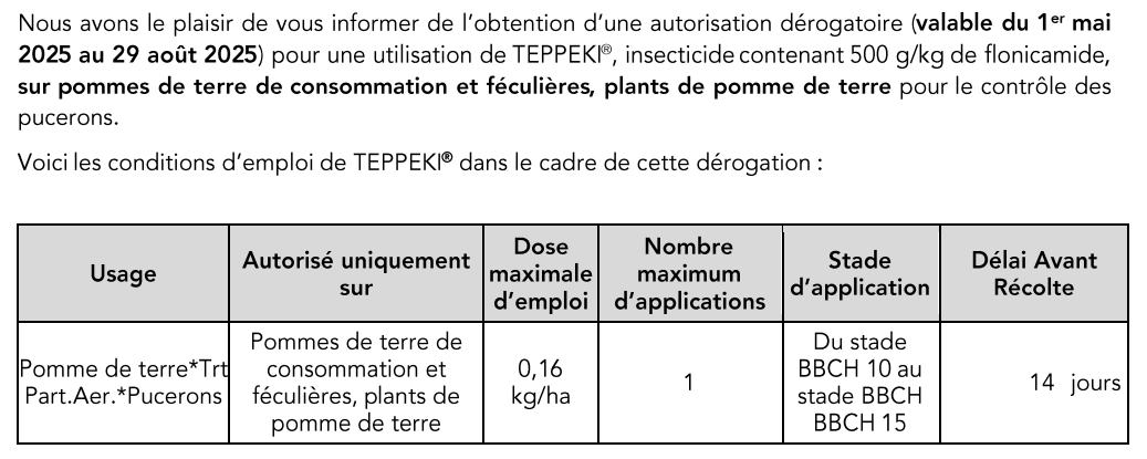 Dérogation TEPPEKI du 1er mai au 29 août 2025 sur pommes de terre de consommation et féculières, et plants de pommes de terre !